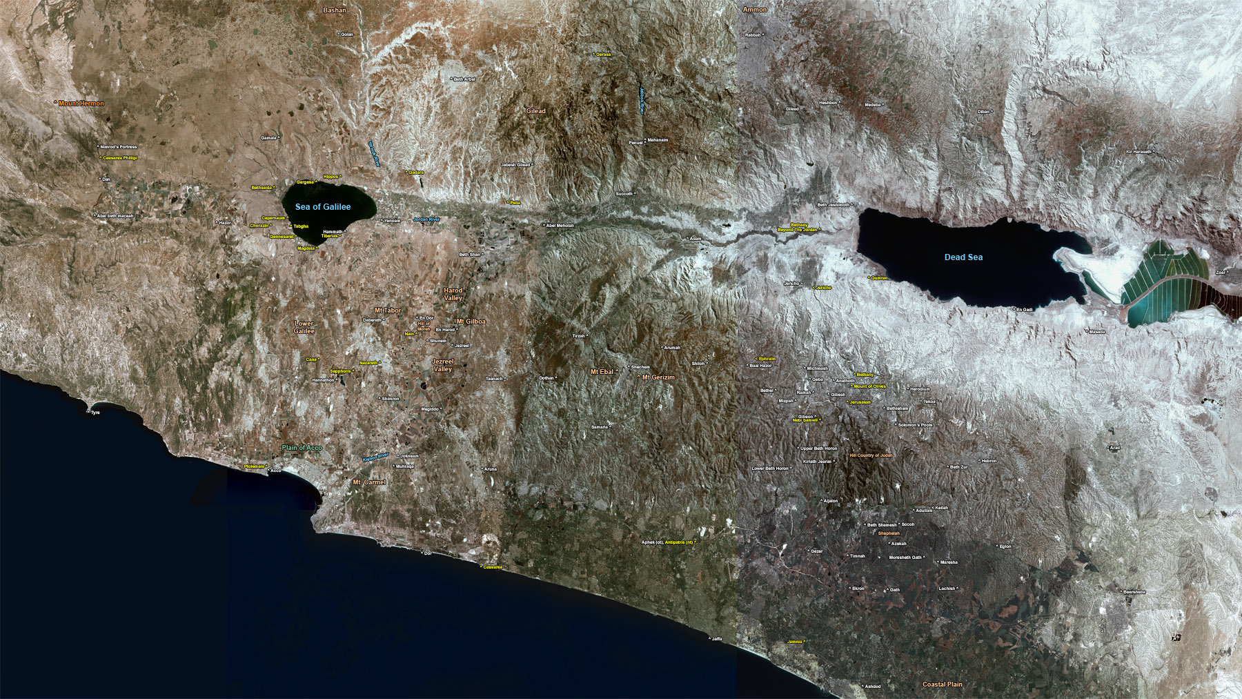 Mount Hermon Nimrod's Fortress Caesarea Phillipi Dan Abel Beth macaah Tyre Ptolemais Acco Plain of Acco Mount Carmel Kishon River Muhraqa Jokneam Shimron Hannathon Sepphoris Nazareth Cana Lower Galilee Daberath Mt Tabor Nain Yenoam Hammath Tiberias Magdala Gennesaret Chorazin Hazor Capernaum Bethsaida Sea of Galilee Gergesa Hippos Yarmuk River Gamala Golan Bashan Beth Arbel Gilead Jabesh Gilead Gadara Jordan River Beth Shan Abel Meholah Pella Harod Valley En Dor Hill of Moreh Shunem En Harod Mt Gilboa Jezreel Jezreel Valley Taanach Dothan Tirzah Megiddo Arumah Dor Caesarea Jaffa Lower Beth Horon Samaria Mt Ebal Shechem Mt Gerizim Mizpah Bethel Baal Hazor Shiloh Ephraim Arumah Adam Succoth Penuel Mahanaim Jabbok River Gerasa Rabbah Ammon Gilead Heshbon Medeba Beth Jeshimoth Jericho Jericho Qumran Micmash Geba Ramah Gibeah Anathoth Bethany Mount of Olives Gibeon Nebi Samwil Jerusalem Herodium Tekoa Bethlehem Solomon's Pools Upper Beth Horon Kiriath Jearim Hill Country of Judah Beth Zur Aijalon Beth Shemesh Socoh Adullam Keilah Shephelah Gezer Timnah Azekah Moresheth Gath Maresha Hebron Ekron Jamnia Ashdod Coastal Plain Gath Lachish Beersheba Eglon Arad Masada En Gedi Kir Hareseth Diban Zoar Bethany Beyond the Jordan Dead Sea Aphek (ot), Antipatris (nt))) Tabgha